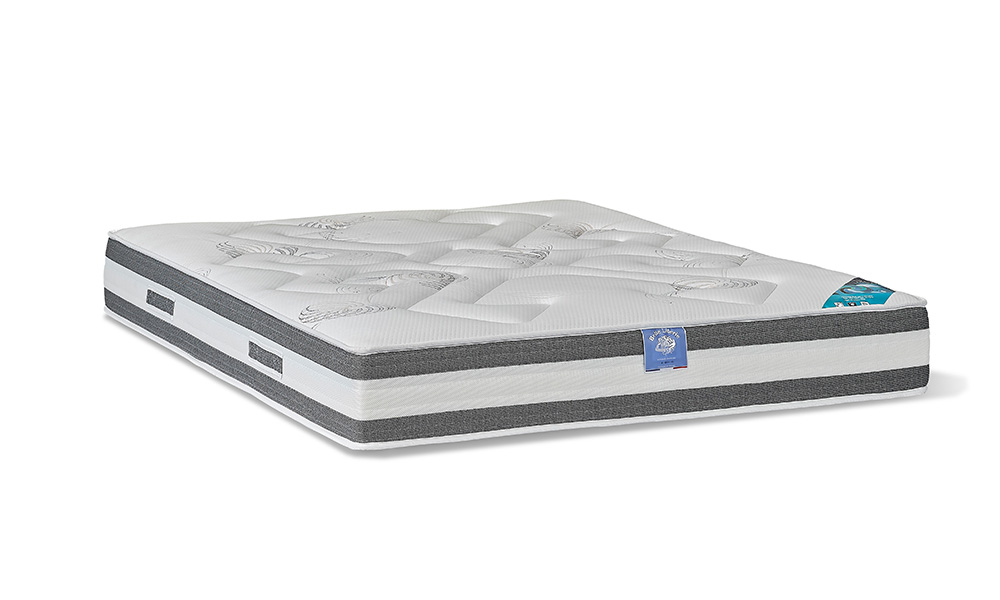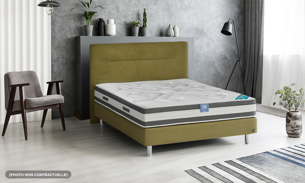Matelas : H.26 cm. Âme polyuréthane HR 100% Soft’air® 35 kg/m3 12 cm enrichi d’huile végétale, 8cm Blue Soft® 40 kg/m3. Zones différenciées de confort. 1 face matelassée lin, coton, ouate blanche 650 gr/m2. 1 face matelassée ouate blanche 350 gr/m2. Coutil 100% polyester. Poignées. Aération périmétrale. Garantie 5 ans. Belle Literie. Qualité certifiée CTB Literie.