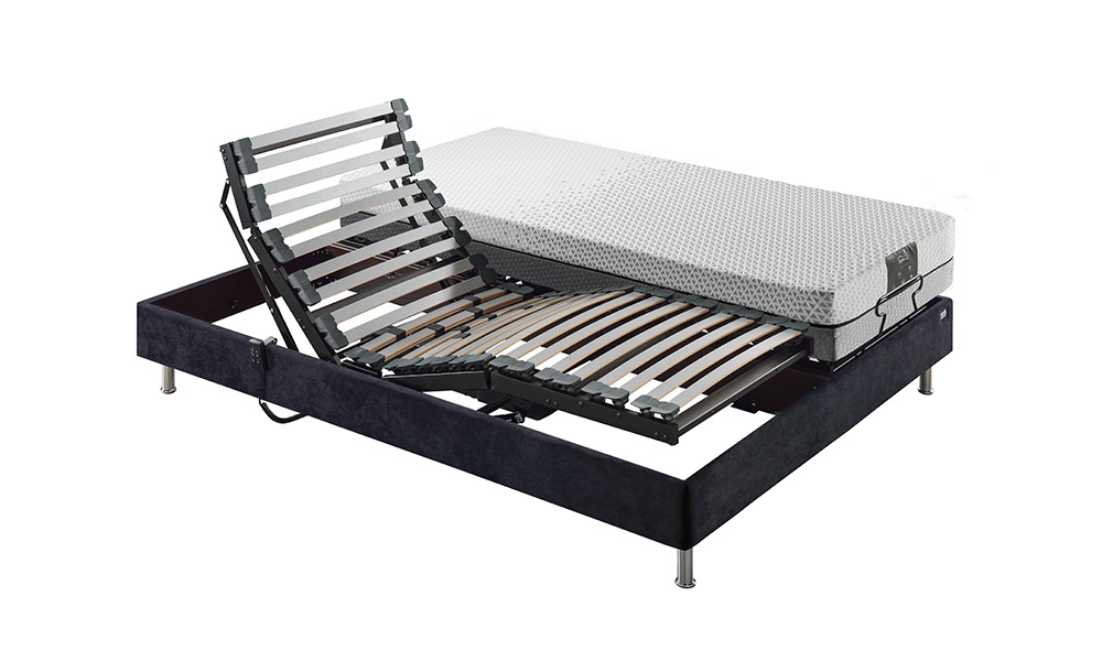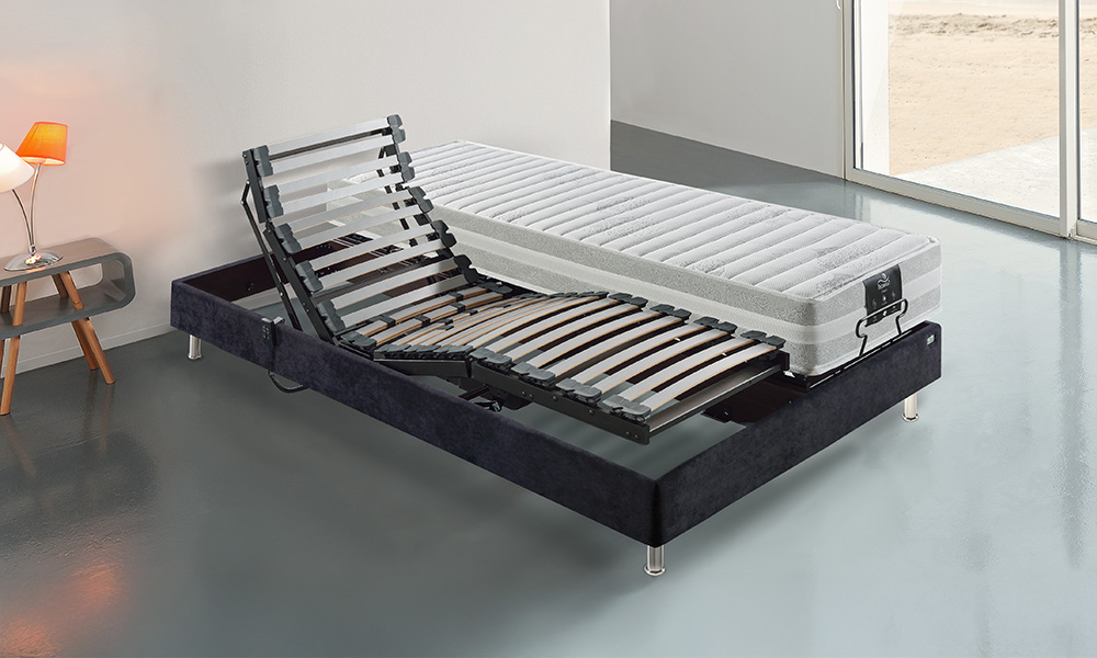 Sommier : Encadrement bois massif latté. Lattes anti-dérapantes multiplis hêtre 7 plis recouvertes film protecteur. Rotules suspendues interactives. Montage par tenons latéraux. Remise à zéro. Garantie 5 ans sommier et moteurs.
